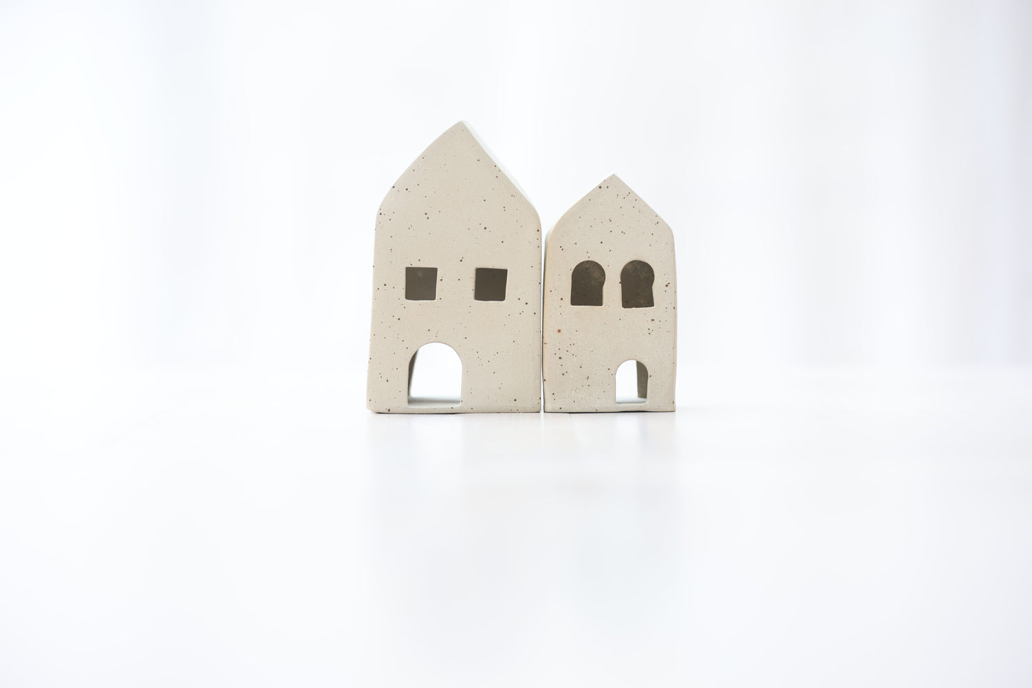 Collection de petites maisons photophores en grès blanc pyrité pour illuminer les...