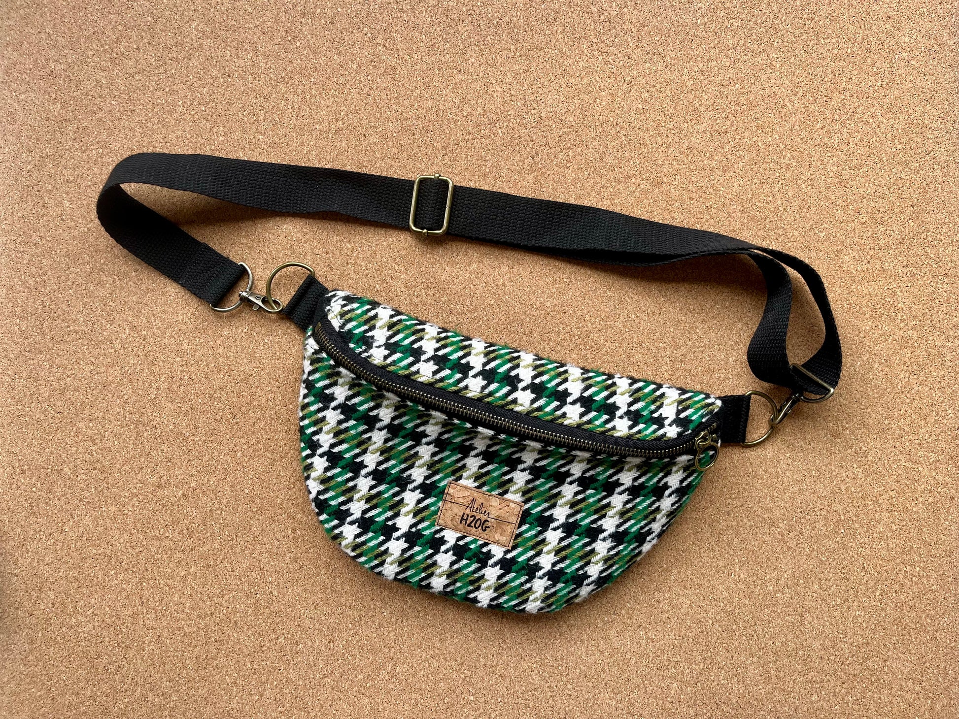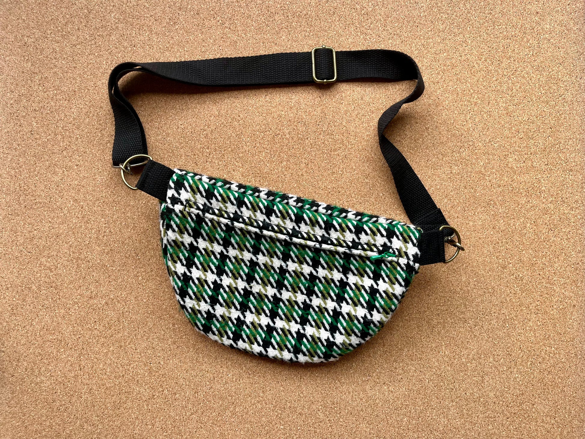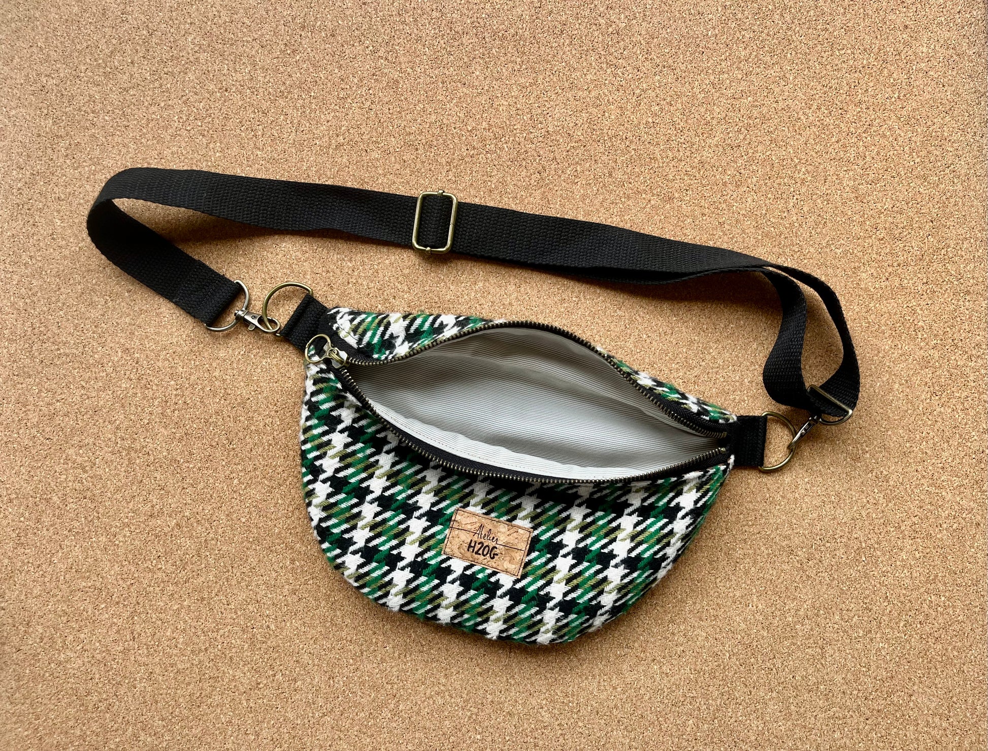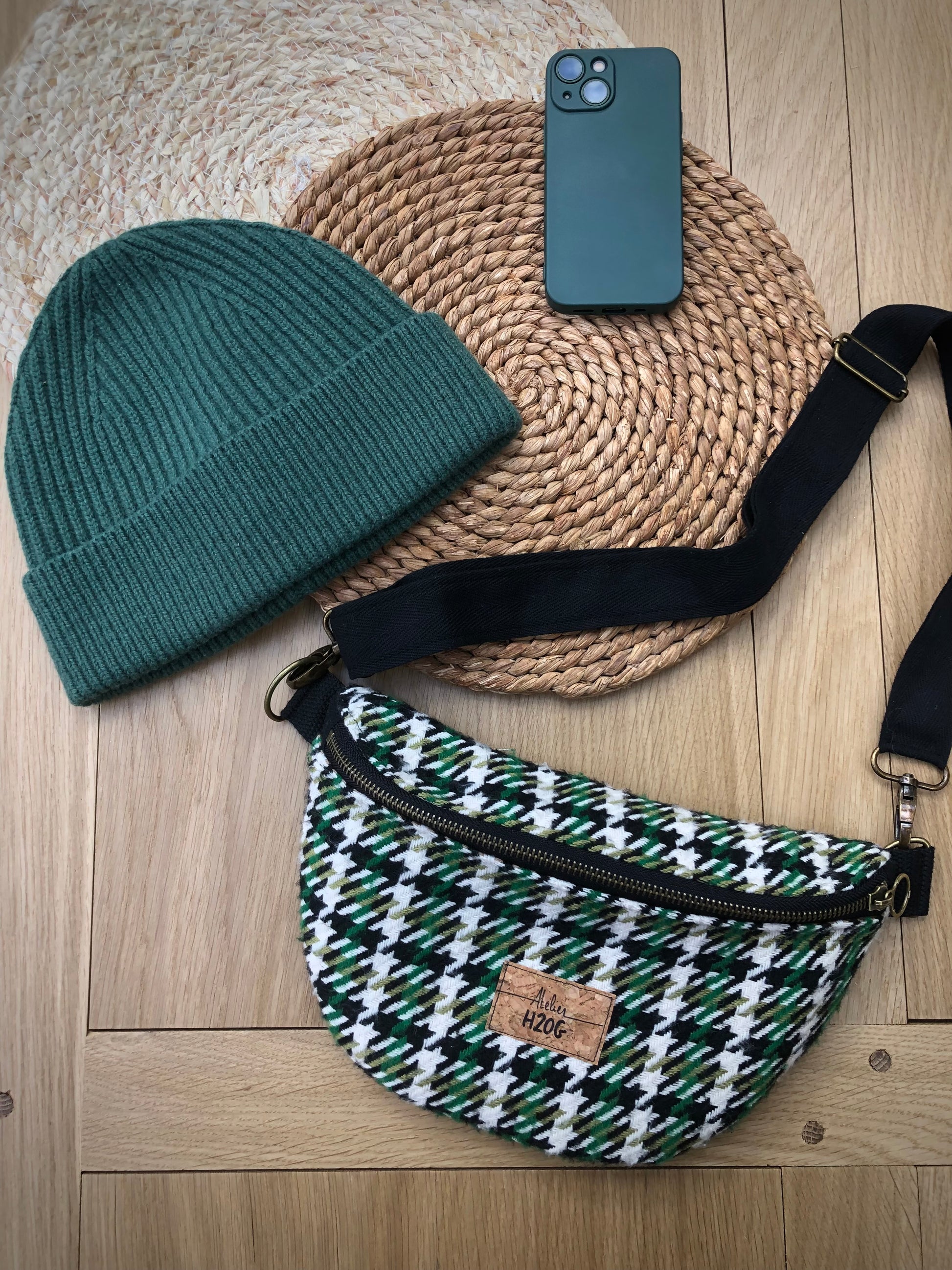 Cette banane a été conçue a partir d'un lainage à poils courts à motif pied de poule vert et noir, issu de chute de fabrication de manteau.